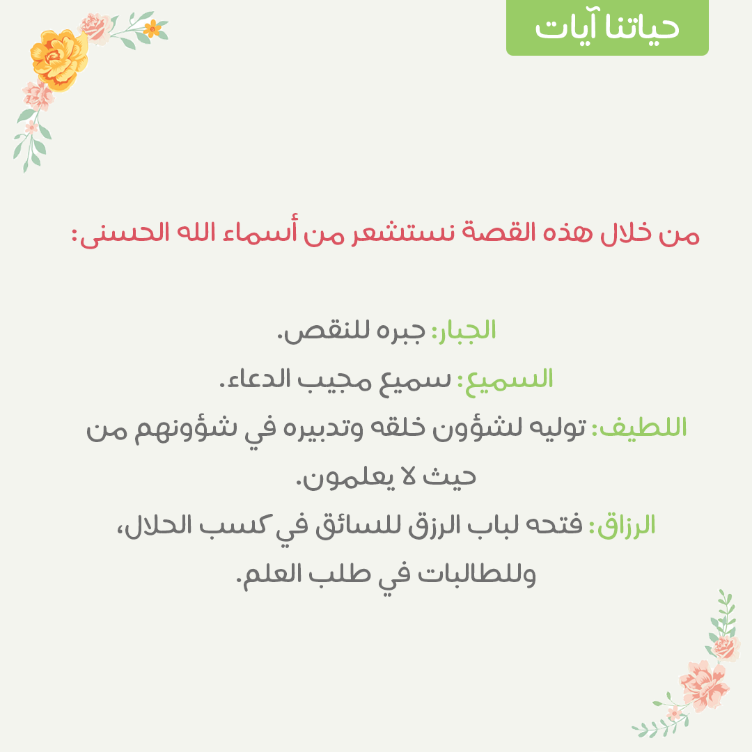 من خلال هذه القصة نستشعر من أسماء الله الحسنى: